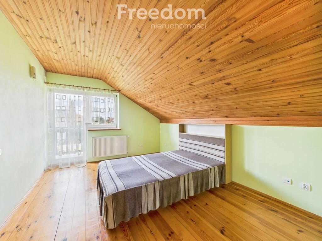 Dach pokryty jest blachą i ocieplony wełną. Okna drewniane